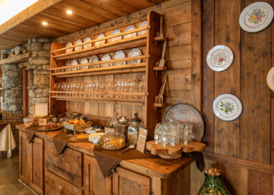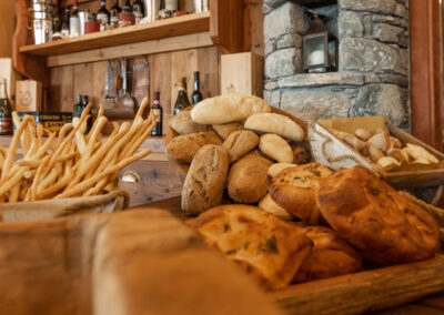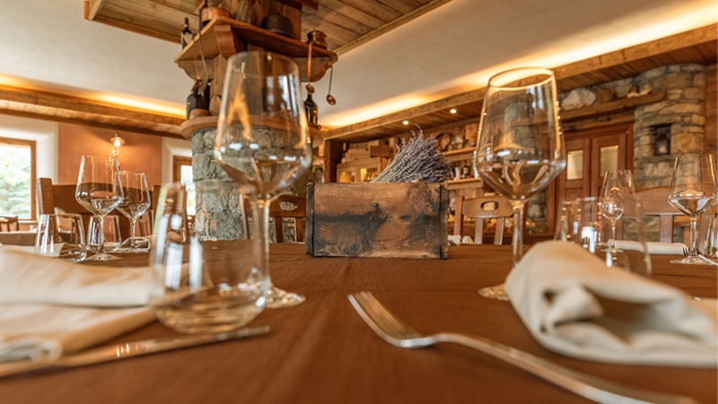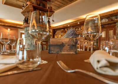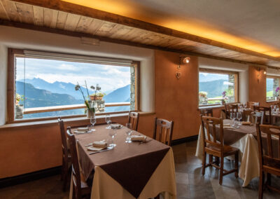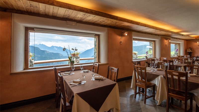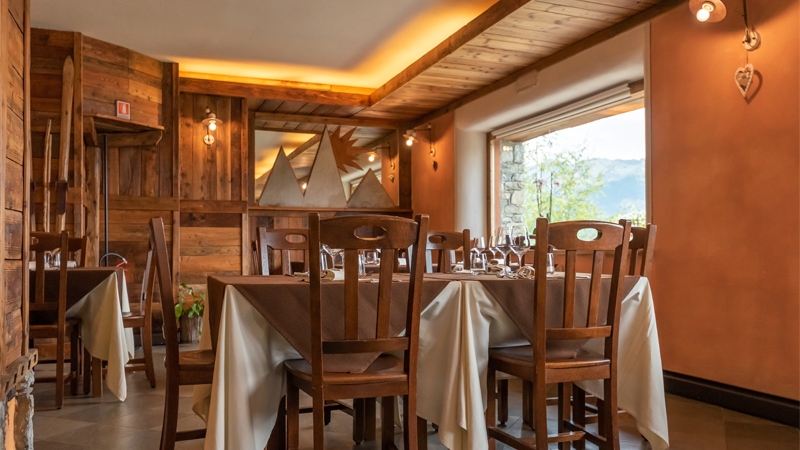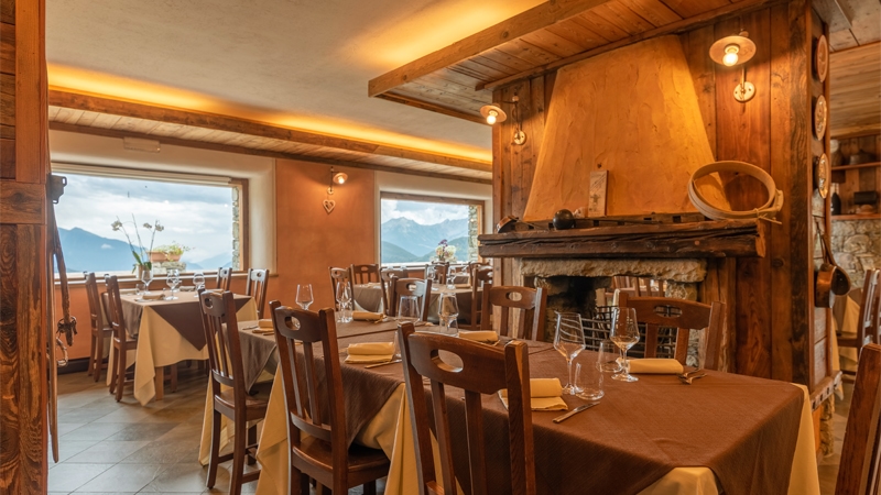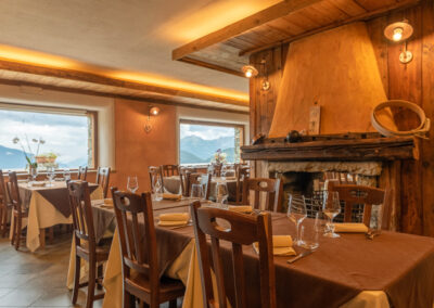 Il ristorante fornisce una atmosfera elegante in contesto tipicamente di montagna, con il calore del camino in inverno e il fresco della montagna in estate, sono la cornice per un pranzo o una cena, in famiglia o tra amici, senza mai perdere di vista il meraviglioso arco alpino che ci circonda.