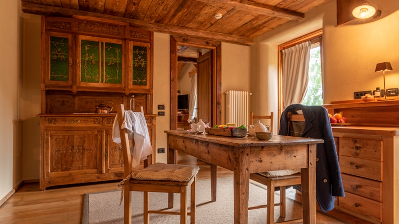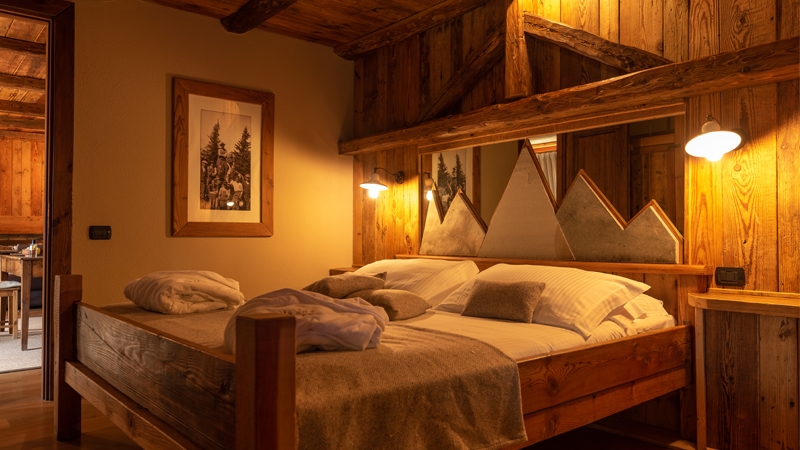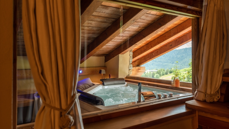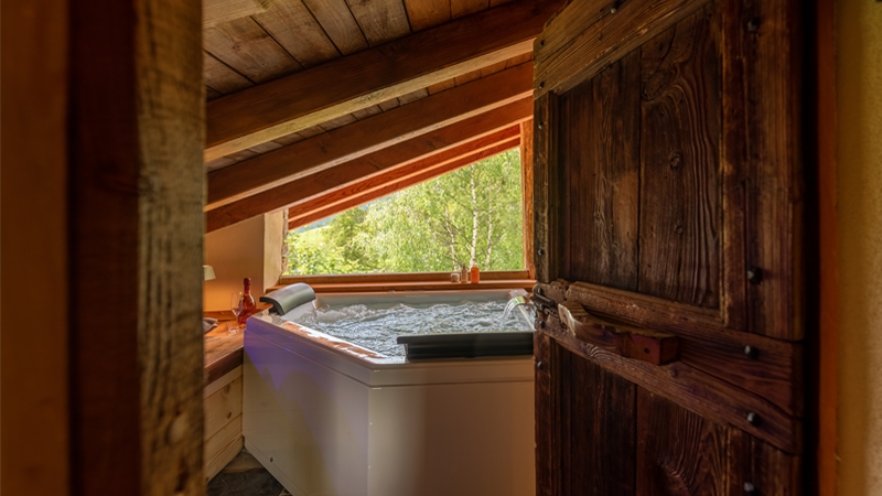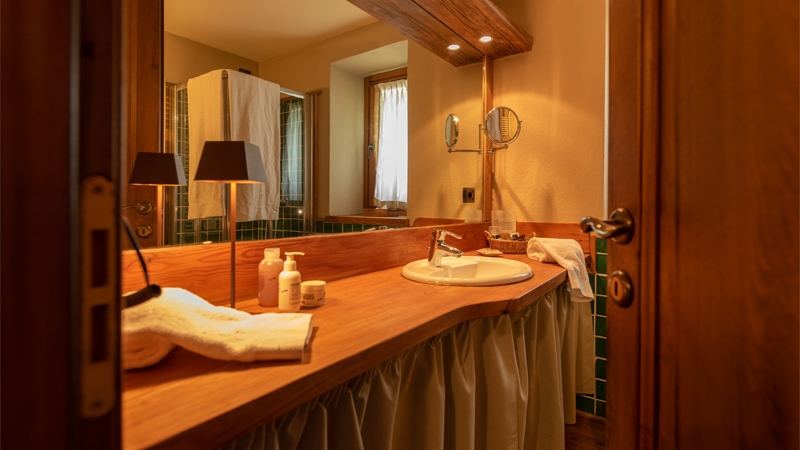 È la camera più romantica, composta da camera da letto matrimoniale, salotto con divano letto, doppi servizi, terrazza vista valle in affaccio sul giardino. Nella loggia esterna la vasca idromassaggio offre, tra i vapori dell’acqua, un panorama impareggiabile.